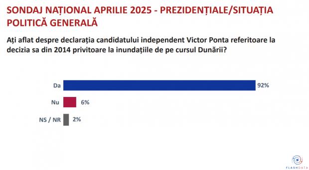 Întrebați dacă au aflat despre declarația lui Victor Ponta – candidat independent la prezidențiale – referitoare la decizia sa din 2014 privind inundațiile de pe cursul Dunării, 92% dintre românii chestionați au răspuns pozitiv, în timp de 6% au răspuns că nu au aflat despre această chestiune.