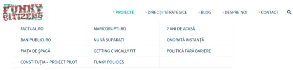 Din nouă site-uri („proiecte”), doar trei îi aparțin: onoratainstanta, educatiecivica și maricorupti.ro. Piatadespaga.ro e domeniu înregistrat de Asociația EPAS, factual.ro e pe numele unei persoane fizice, baniipublici.ro apaține din 2008 unui SRL cu servicii de consultanță în afaceri și management, 7anideacasa.eu este inactiv, nuvasuparati.info e înregistrat de ActiveWatch și administrat de cineva de la Fundația Ceața, iar politicafarabariere e un blog pe wordpress.com. Nu e funky?