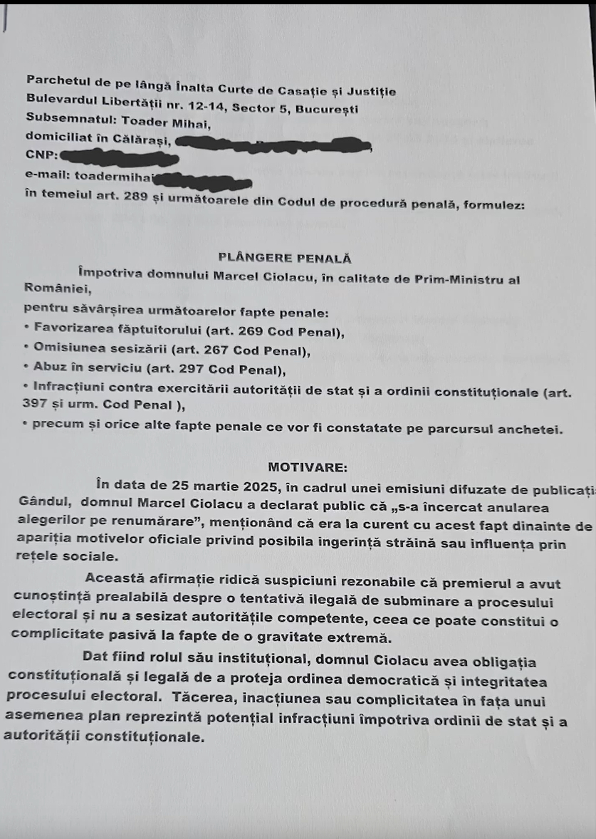 Realitatea Plus a prezentat textul plângerii în premieră. Autorul susține că prin felul în care a formulat presupunerea, Marcel Ciolacu “ridică suspiciuni rezonabile” că ar fi avut cunoștință prealabilă.