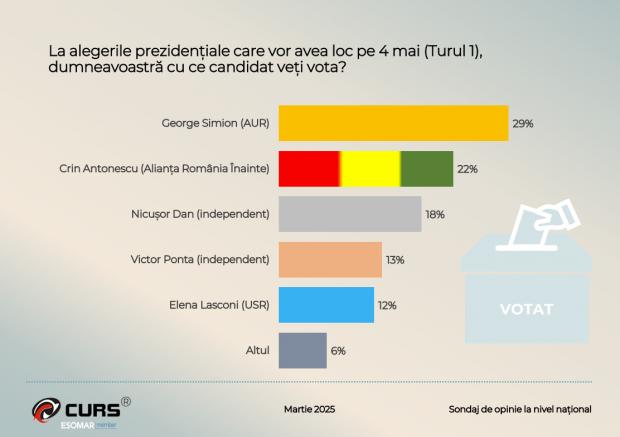 29% dintre românii care au răspuns unui sondaj CURS ar vota în 4 mai la alegerile prezidențiale cu George Simion, iar 22% cu Crin Antonescu. În ceea ce privește sentimentele față de România, 39% simt dezamăgire, iar 59% cred că țara se îndreaptă într-o direcție greșită.