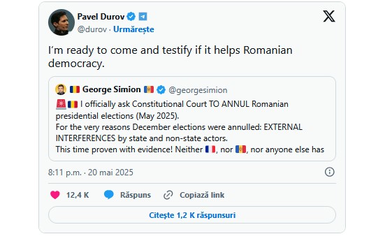 Anunț-bombă al lui Pavel Durov, fondatorul rețelei de mesagerie Telegram. La scurt timp după ce liderul AUR George Simion a anunțat că va contesta la CCR rezultatele alegerilor și a invocat inclusiv acuzațiile lansate de Durov, acesta a transmis că este gata să vină să depună mărturie, dacă astfel “ajută democrația”.