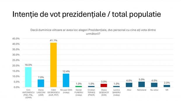 Realizat în perioada 14 – 18 februarie 2025, prin metoda CATI (telefonic), pe 1000 de subiecți, sondajul de opinie realizat de “Verifield” precizează că, în primul tur al alegerilor prezidențiale, Călin Georgescu ar urma să se impună categoric – cu 41,1% de voturi. Alături de acesta, care se află sub control judiciar, în turul II la alegerile prezidenţiale, ar urma să intre Crin Antonescu – 18,5%.